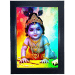 Transform your space with this stunning Child Bal Krishna photo frame, featuring a vibrant and colourful portrait adorned with traditional ornaments and peacock feathers. The frame measures 25 × 34 centimetres, making it an ideal size for prominent display in your home or prayer area. Crafted with a sleek grey fibre frame and medium density fibreboard backing, this vertical orientation frame showcases a beautiful glitter finish that adds an extra dimension of sparkle to the divine imagery. The frameless design without glass allows for direct appreciation of the artwork’s details. Weighing 480 grams, this durable photo frame is perfect for housewarming gifts.